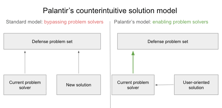 So, what’s so instructive about this as it relates to defense innovation? Indirect yet simple solutions are often the best. Palantir has never sold its users a silver bullet. Let’s call 9/11 the initial problem Palantir sought to solve. Palantir never offered a direct means to solving this. Its irreducible value proposition was: open data silos → synthesize data into actionable insights. Its founding team recognized a powerful truth: the best solutions to massive problems often don’t solve the problems themselves; they help the problem solvers to elegantly solve the problem in a big way. The defense and intelligence community is a treasure trove of gifted problem solvers. So many of the problems around defense innovation require this simple solution framework that aims to remove handicaps from the people that solve the problems-- from non-physical data silos to physical supply problems.